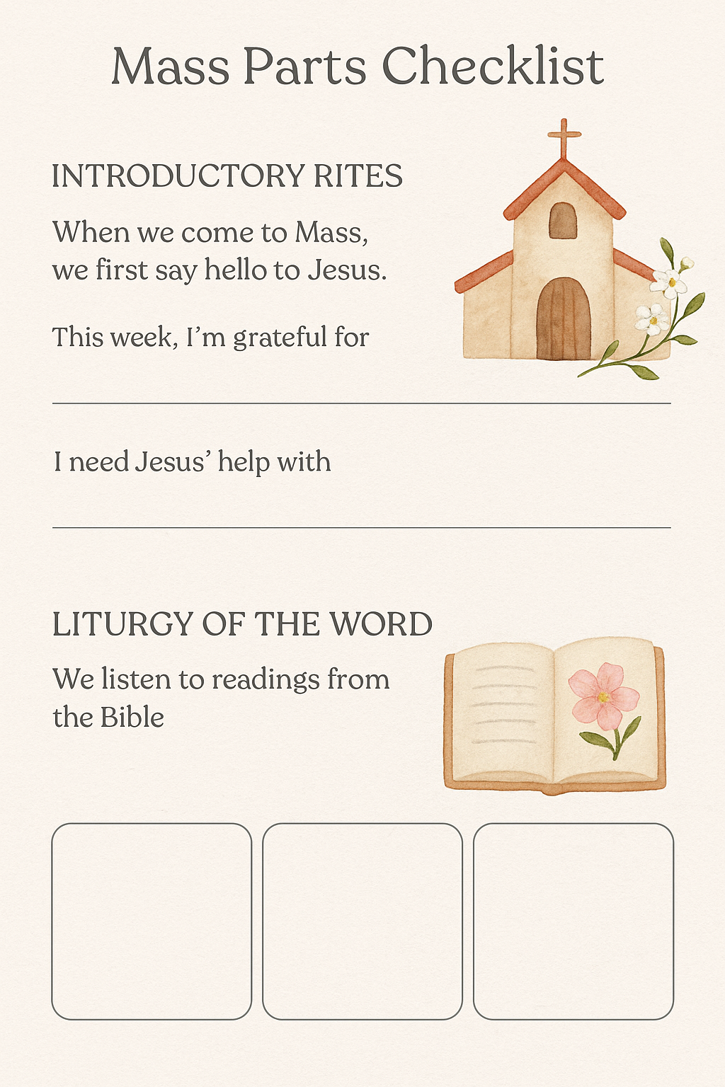 This printable helps children follow along during Mass by understanding its four parts — the Introductory Rites, Liturgy of the Word, Liturgy of the Eucharist, and Concluding Rites.
